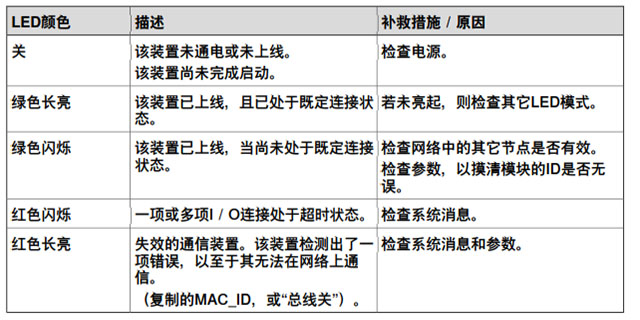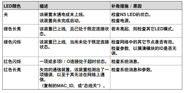 雙色(綠色/紅色)LED用于指示通信鏈路的狀態。該LED由軟件控制。下表展示了 NS LED的不同狀態。