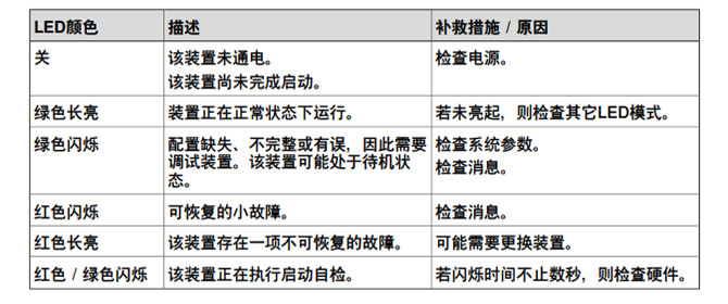 雙色(綠色/紅色)LED用于指示裝置狀態,以表明裝置是否通電以及是否在正常運 行。該LED由軟件控制。下表展示了MS LED的不同狀態。