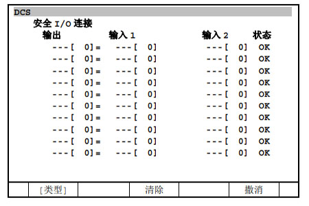 產品描述:安全I/O連接 1. 按下[MENU](菜單)鍵。 2. 選擇“系統”。 3. 按下 F1“類型”。 4. 選擇“DCS”。 5. 不是DCS的頂層畫面或者安全I/O連接畫面的情況下,按下[PREV]鍵,選擇[安全I/O連接]。顯示如下所示的畫面。 6. 設定SIR[1]=CPC[1](負載切換區域的直角坐標位置檢查)。