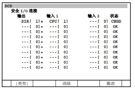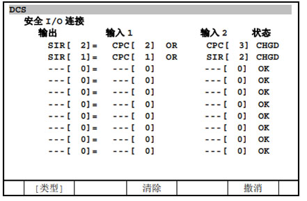 5. 不是DCS的頂層畫面或者安全I/O連接畫面的情況下,按下[PREV]鍵,選擇[安全I/O連接]。顯示如下所示的畫面。