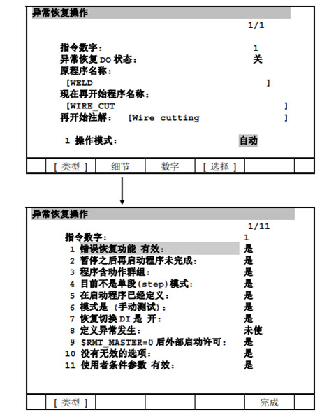 示教器上的STEP(單步)LED,顯示原程序的單步狀態。因此,在再啟動程序暫停中,按下STEP“單步”鍵,即使 STEP LED點亮,異常恢復DO依然保持接通狀態。這是因為L E D表示原程序處于單步狀態,再啟動程序不是單步之故。