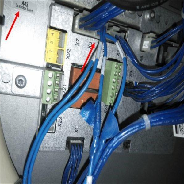 具體操作方式:在控制柜左下角找到A43板,找到板子上5插頭,上邊有4根線,其中線號為439和440的兩根線就是電機過熱報警信號線將兩根線從中間斷開,把板子這邊的兩根線短接即可。(如下圖)